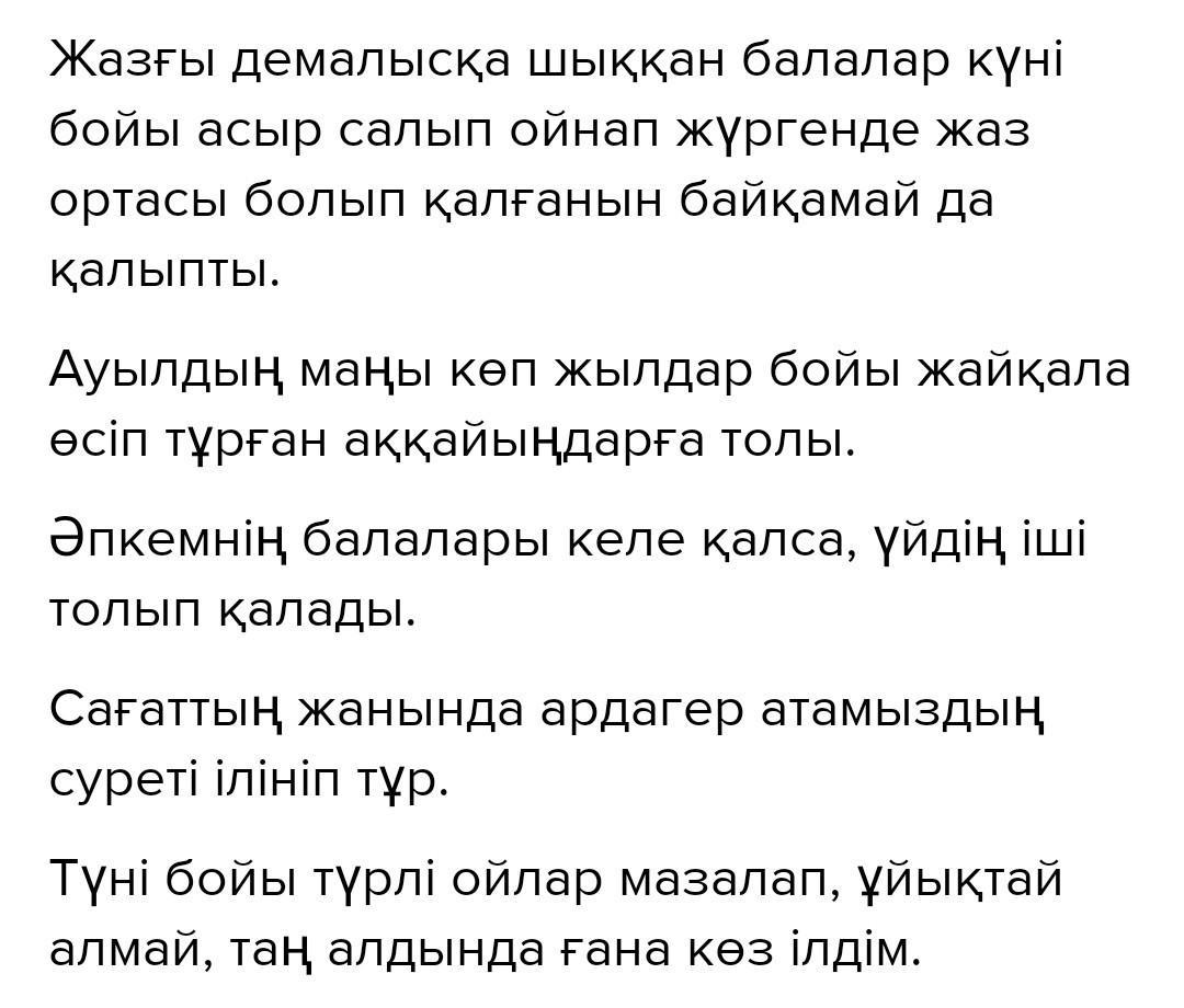 Жаз ортасы, ауылдын маны, уйдiн iшi, сағаттын жанында, тан алдында.