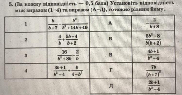 5.Установіть відповідність між виразом(1-4) та виразом(А-Д), тотожно рівним йому.