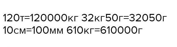 Ответ:120т=120000кг32кг50г=32050г10см=100мм610кг=610000кг