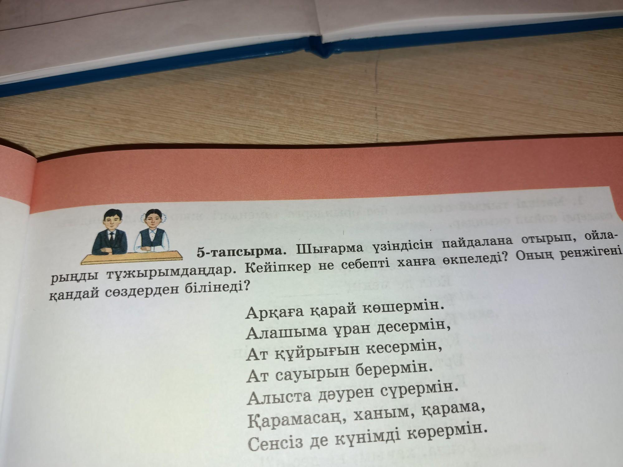 5-тапсырма. Шығарма үзіндісін пайдалана отырып , ойларында тұжырымдаңдар . Кейіпкер не себепті ханға өкпеледі ? оның ренжігені қандай сөздерден білінеді