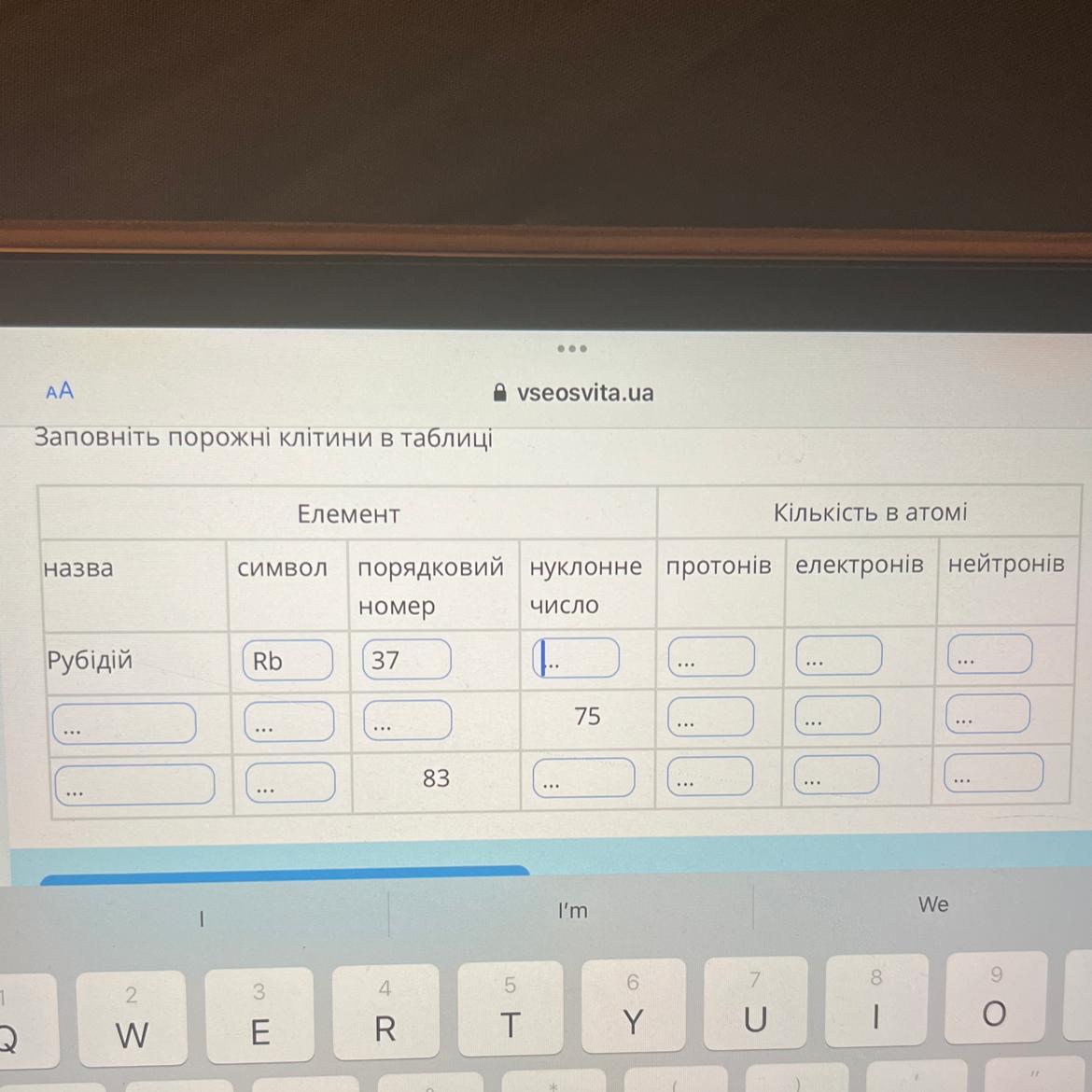 Ответ:1) Рубідій Rb 37 85 37 37 48 ; 2)Миш'як As 33 75 33 33 42 ;