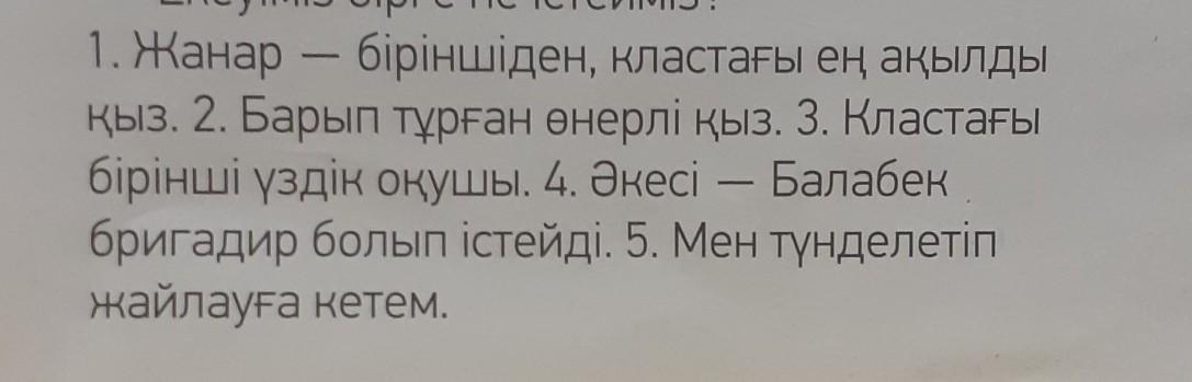 Ответ:1. Жанар, прежде всего, самая умная девочка в классе. 2. Артистичная девушка, которая собирается. 3. Первый ученик в классе. 4. Отец - Балабек работает мастером. 5. Я проведу ночь на пастбище