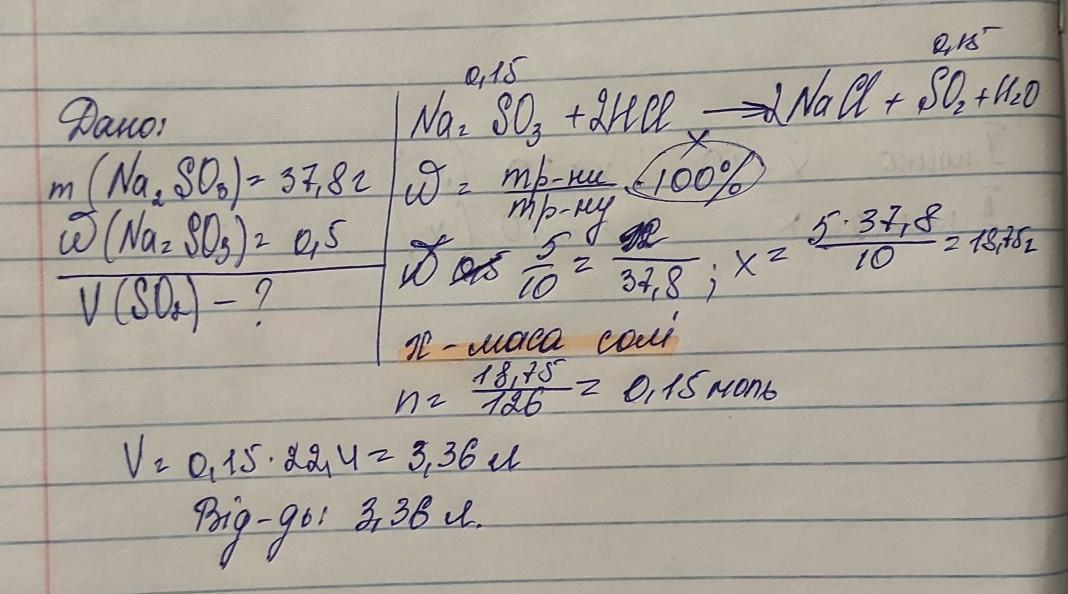 Срочно! До розчину натрій сульфіту масою 37,8 г із масовою часткою солі 15% додали хлоридну кислоту. Обчислити об’єм газу(н.у.), що виділився.