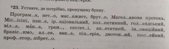 Відповідь: программа,нетто, масажист, брутто,Мангеланова протока, Міссісіпі,пана, ірраціональний, колективний, голландський,вілла,манна ,грам, спагетті, апетитний, інноваційний,бравіссимо , алея,ванна, піцерія , двотонний , шосейний, професор, лібрето.
