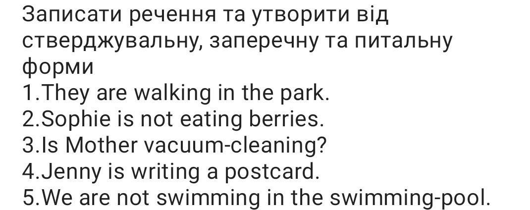 Записати речення та утворити від стверджувальну, заперечну та питальну форми