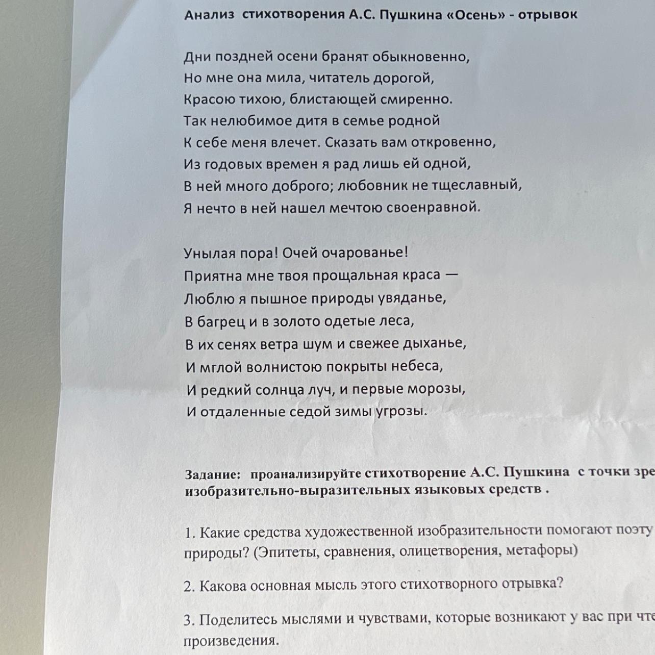 ПОМОГИТЕ СРОЧНО! ДАМ 20 БАЛЛОВ! НАДО ПРОАНАЛИЗИРОВАТЬ СТИХОТВОРЕНИЕ А.С ПУШКИНА «ОСЕНЬ»