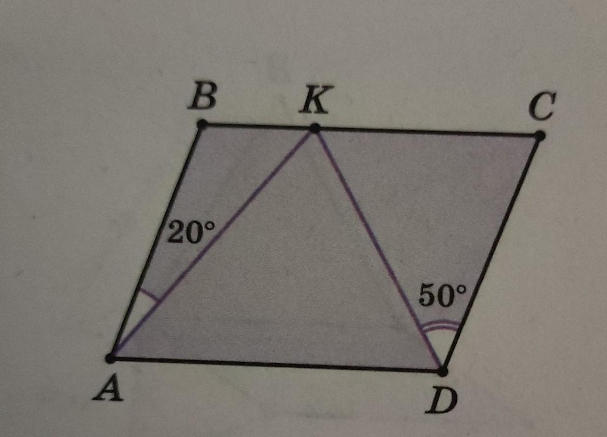 На стороне ВС параллелограмма ABCD взяли точку К. Оказалось, что угол ВАК равен 20°, а угол СDK равен 50º. Найдите угол AKD.