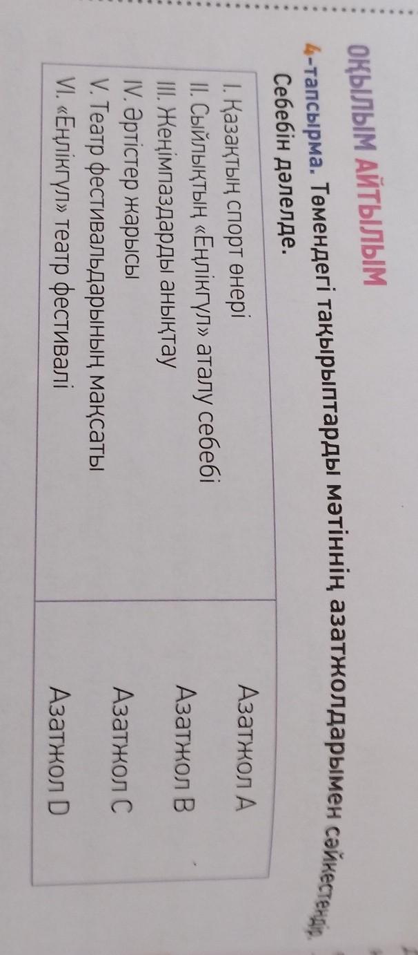 4-тапсырма. Темендегі тақырыптарды мәтіннің азатжолдарымен сәйкестендір. Себебін дәлелде. 1. Қазақтың спорт енері II. Сыйлықтың «Еңлікгүл» аталу себебі III. Жеңімпаздарды анықтау IV. Әртістер жарысы V. Театр фестивальдарының мақсаты VI. «Еңлікгүл» театр фестивалі Азатжол А Азатжол В Азатжол С Азатжол