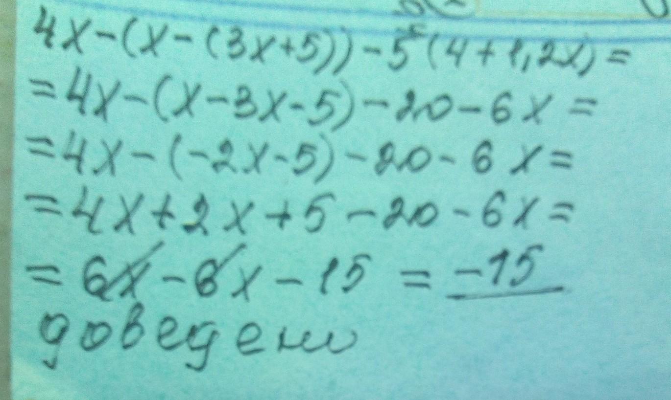 Доведіть що значення виразу не залежить від значення змінної: 4x- (x-(3x+5))-5(4+1.2x)