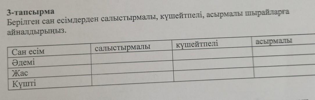 Күшейтпелі шырай: жап-жақсы, әп-әдемі, сұп-сұлу, қып-қызыл, жап-жасыл, көкпеңбек, дәп-дәмді, қып-қышқыл, қымбат.