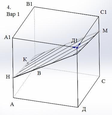 4. Побудувати переріз куба ABCA A^ * B^ * C^ * B^ * площиною, яка проходить через точки М, Н, К, якщо т. Ме C C^ * так, що C ^ * M : MC = 1/2 т. H in A^ * . так, що д*н: A = 3/1 точка К належить гранi ( AB B^ * )
