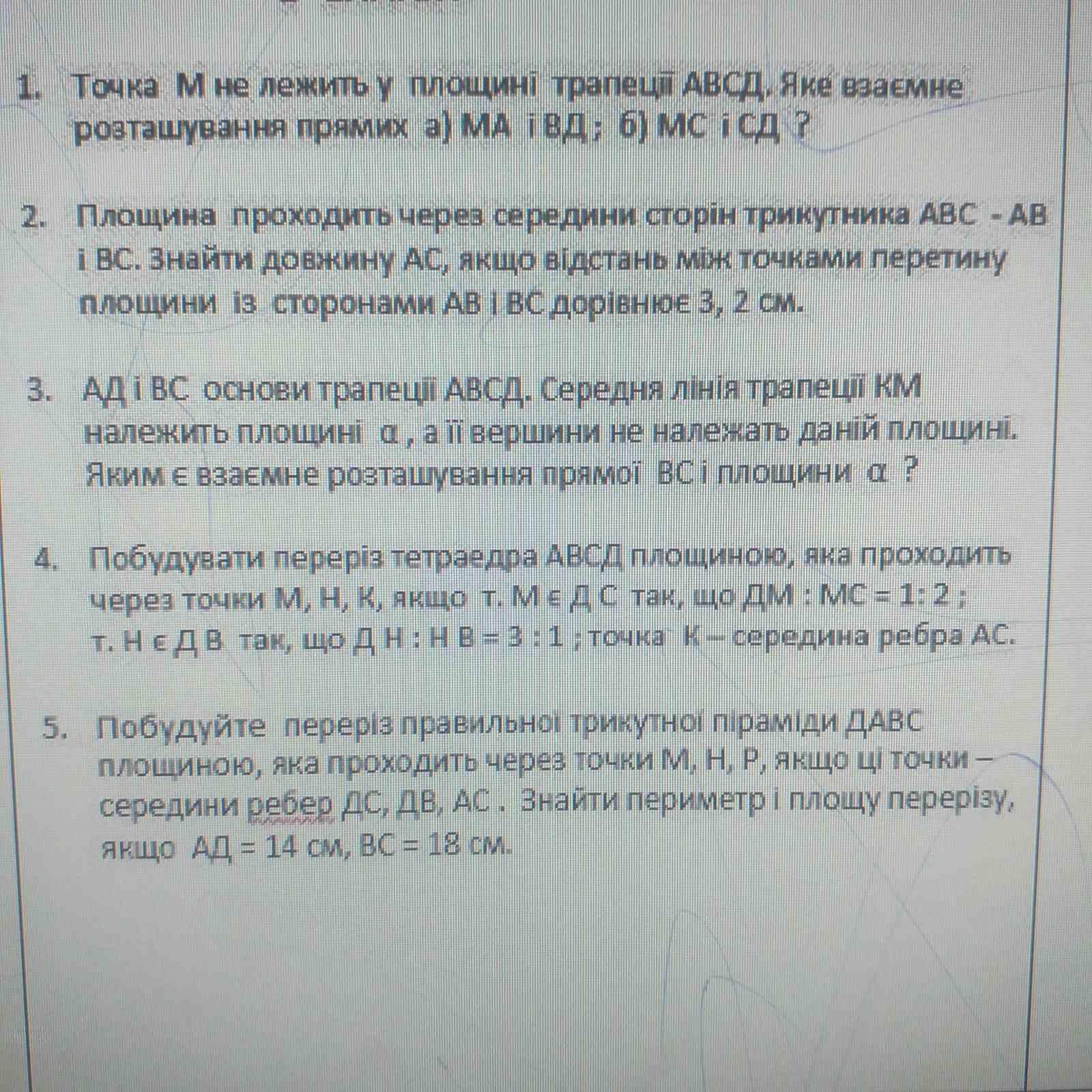 1. Точка М не лежить у площині трикутника АВС. Яке взаємне розташування прямих а) MC IAC; 6)MA IBC ?