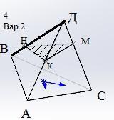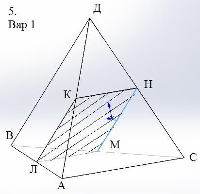 5. Побудуйте переріз тетраедра ДАВС площиною, яка проходить через точку М-середину ребра ВС паралельно прямим АСТ ДВ. Знайти периметр і площу перерізу, якщо всі ребра тетраедра дорiвнюють 10 см.