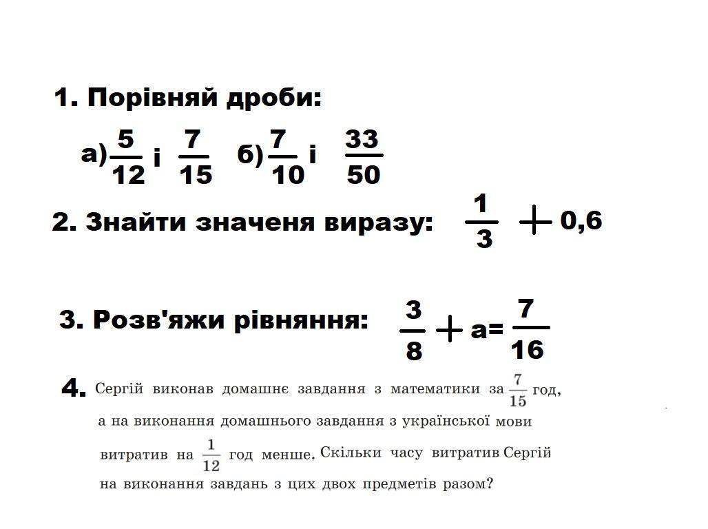 2) 7/15 + 23/60 = 28/60 + 23/60 = 51/60 = 17/20 (часа) - потратил Сергей на выполнение математики и украинского языка