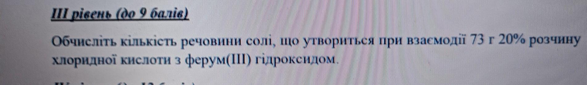 III рiвень (до 9 балів) Обчисліть кількість речовини солі, що утвориться при взаємодії 73 г 20% розчину хлоридної кислоти з ферум(III) гідроксидом.