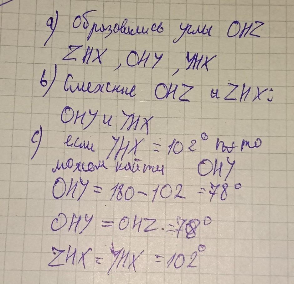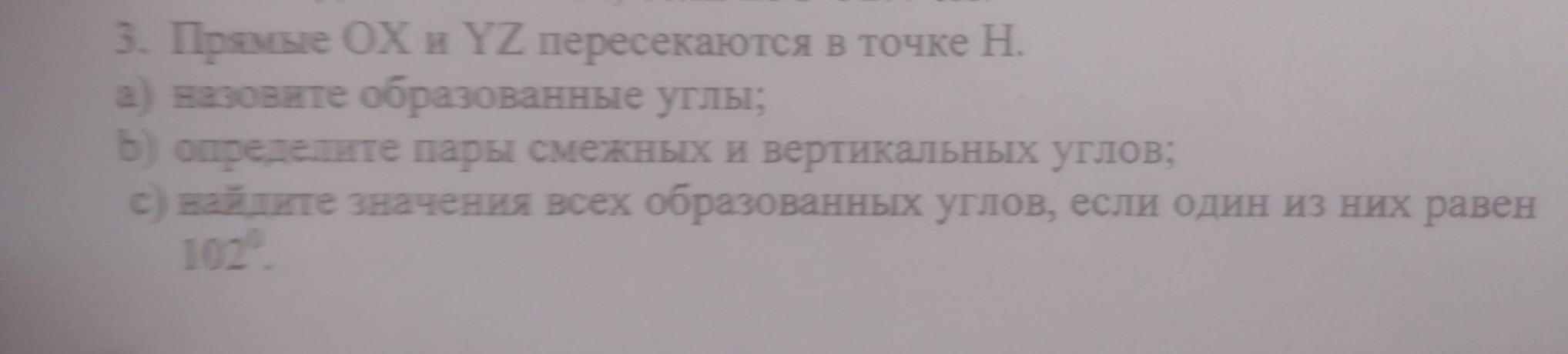 3. Прямые ОХ и YZ пересекаются в точке Н a) назовите образованные углы; b) определите пары смежных и вертикальных углов с) найдите значения всех образованных углов, если один из них равен 102°