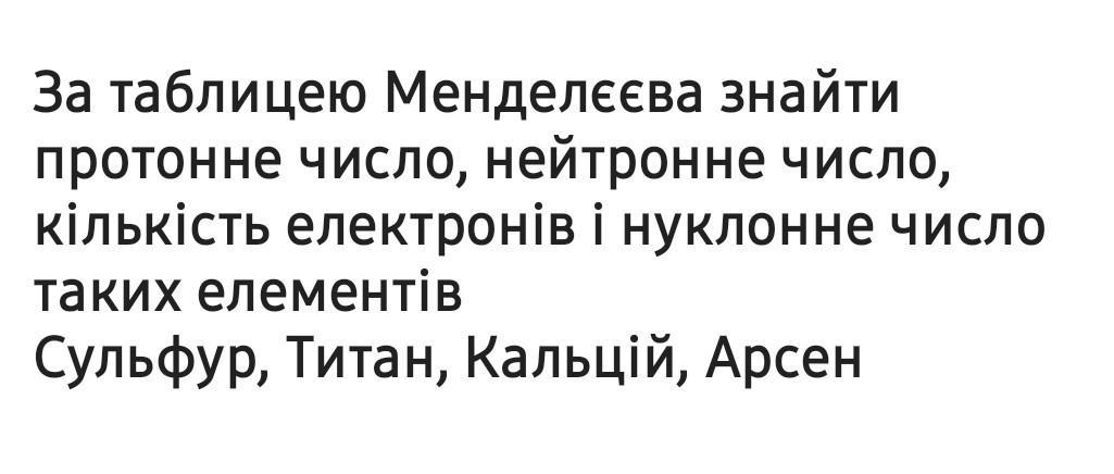 За таблицею Менделеева знайти протонне число, нейтронне число, кількість електронів і нуклонне число таких елементів Сульфур, Титан, Кальцій, Арсен