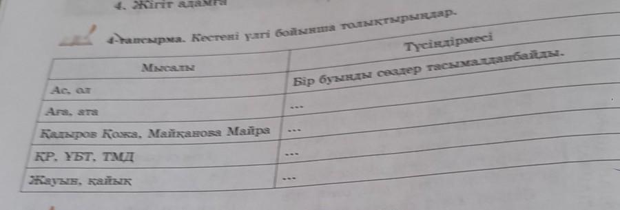 Ас, ол Аға, ата 4-тапсырма. Кестені үлгі бойынша толықтырындар. Мысалы Кадыров Кожа, Майканова Майра ҚР, ҰБТ, ТМД Жауын, қайық Бір буынды сөздер тасымалданбайды. ... ... Түсіндірмесі ...