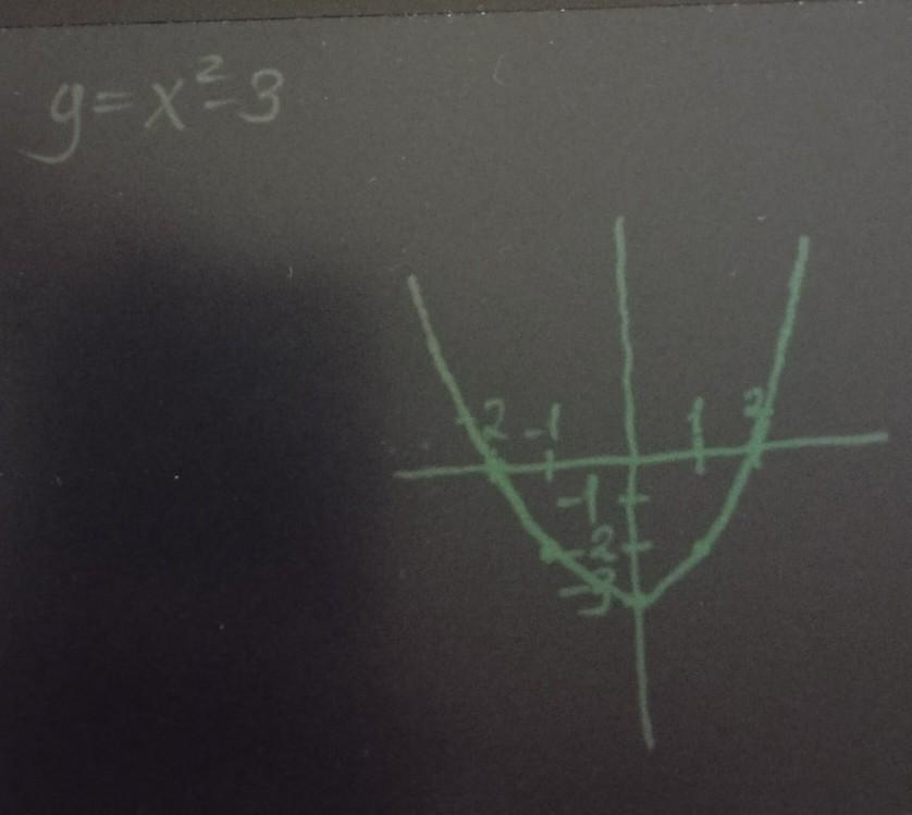 это квадратичная функция, графиком является парабола. сначала берём и спускаем ее на 3 единицы вниз по игрику. это будет вершина параболы, ставим там точку жирную. а уже от нее идут ветви параболы, их строим по точкам(1;-2),(2;0) и откладываем симметрично такие же точки, чтобы получить вторую ветку (-1;-2),(-2;0). и всё.
