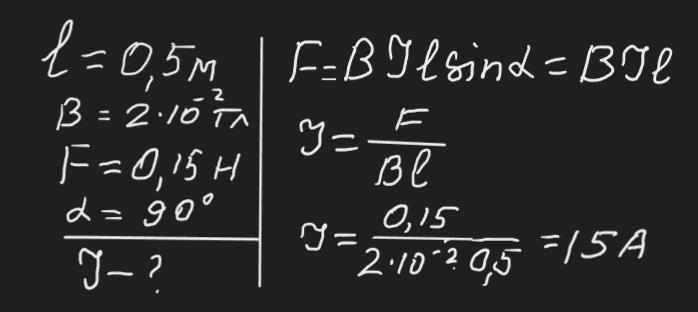 на провідник довжиною 0,5м. перпендикулярно до ліній магнітного поля індукцією 2*10-2Тл діє сила 0,15Н.Яка сила струму тиче в провіднику? срочно,даю 90 балов