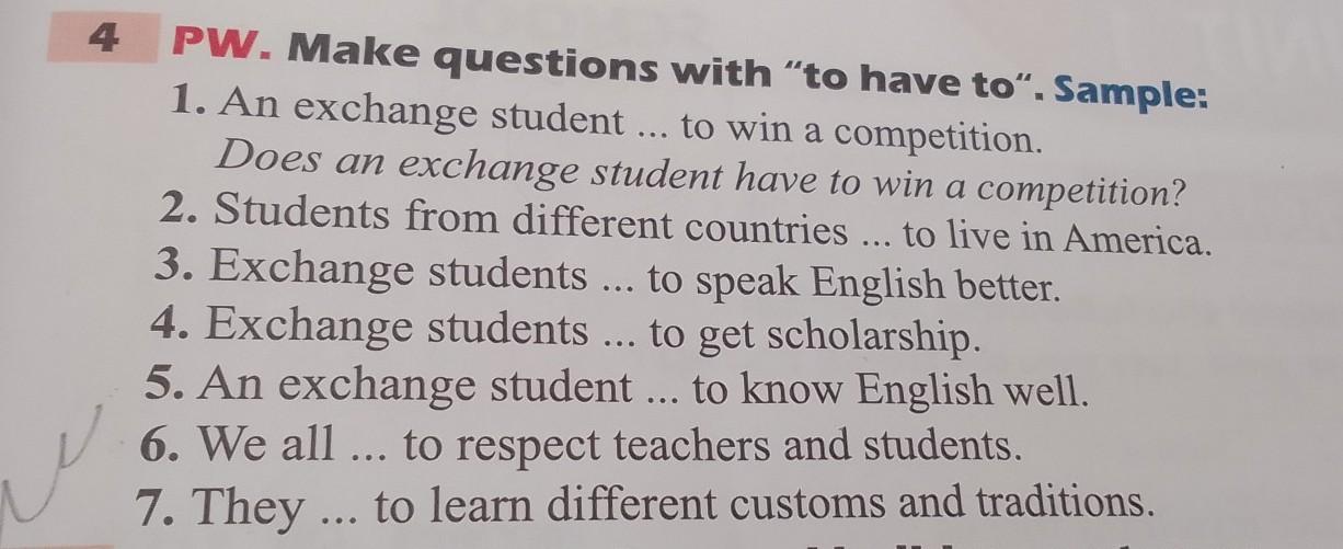 2. Do students from different countries have to live in America? 3. Do exchange students have to speak English better? 4. Do exchange students have to get scholarship? 5. Does an exchange student have to know English well 6. Do we all have to respect teachers and students? 7. Do they have to learn different customs and traditions?