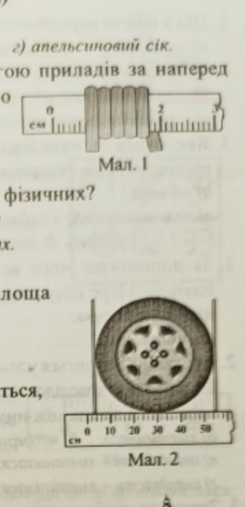 Рівень С (достатній) в п 1. Визначити ціну поділки шкали лінійки та діаметр дроту, намотаного на лінійку так, як показано на малюнку 1. 2. Визначити ціну поділки шкали лінійки та площу круга, обмеженого автомобільним колесом (мал.2). пжпжпжпж даю 70 балов.