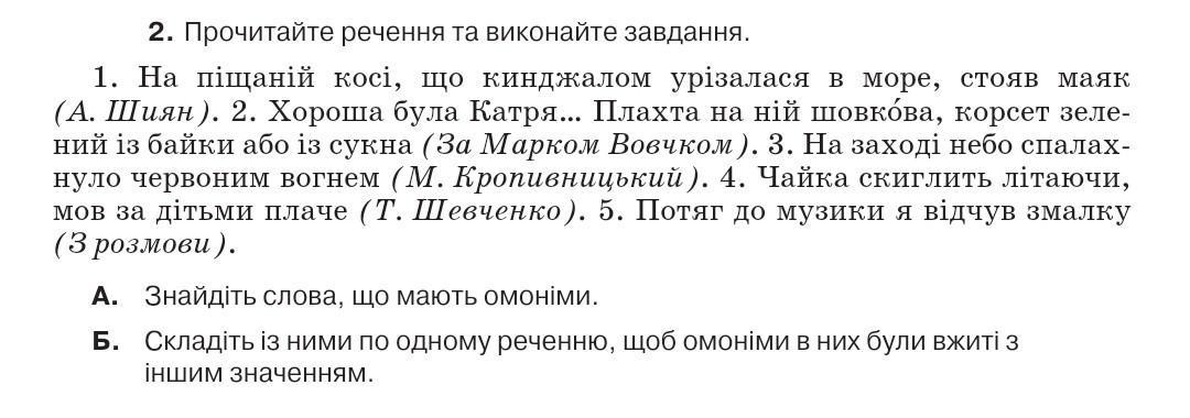 2. Прочитайте речення та виконайте завдання. 1. На піщаній косі, що кинджалом урізалася в море, стояв маяк (А. Шиян). 2. Хороша була Катря... Плахта на ній шовкова, корсет зеле- ний із байки або із сукна (За Марком Вовчком). 3. На заході небо спалах- нуло червоним вогнем (М. Кропивницький). 4. Чайка скиглить літаючи, мов за дітьми плаче (Т. Шевченко). 5. Потяг до музики я відчув змалку (З розмови). А. Знайдіть слова, що мають омоніми. Б. Складіть із ними по одному реченню, щоб омоніми в них були вжиті з iншим значенням.