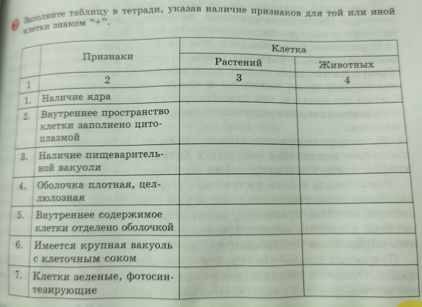 СРОЧНО ПОМОГИТЕ Заполните таблицу в тетради, указав наличие признаков для той или иной клетки знаком "+". Признаки Клетка Растений 1 2 Наличие ядра 3 Животных 4 1. 2. Внутреннее пространство клетки заполнено цито плазмой 3. 4. Наличие пищеваритель ной вакуоли Оболочка плотная, цел люлозная Внутреннее содержимое клетки отделено оболочкой 5. 6. 7. Имеется крупная вакуоль С клеточным соком Клетки зеленые, фотосин тезирующие