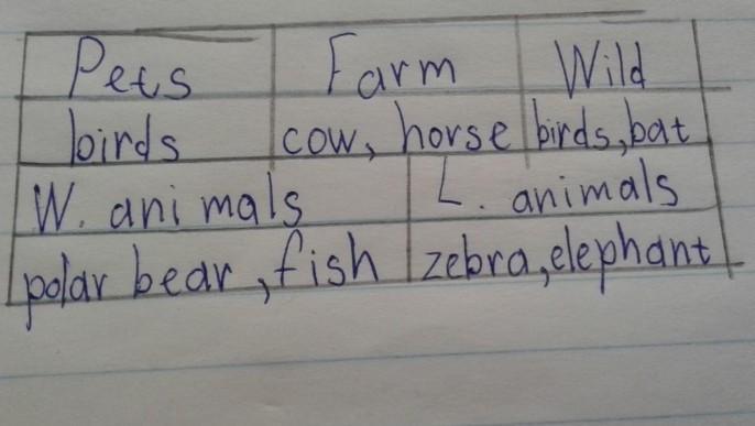 2 Copy and complete the table. Work with a partner. Put the animals in the correct columns. Some animals can go in more than one column. Pets birds Water animals Farm animals Wild animals birds Land animals