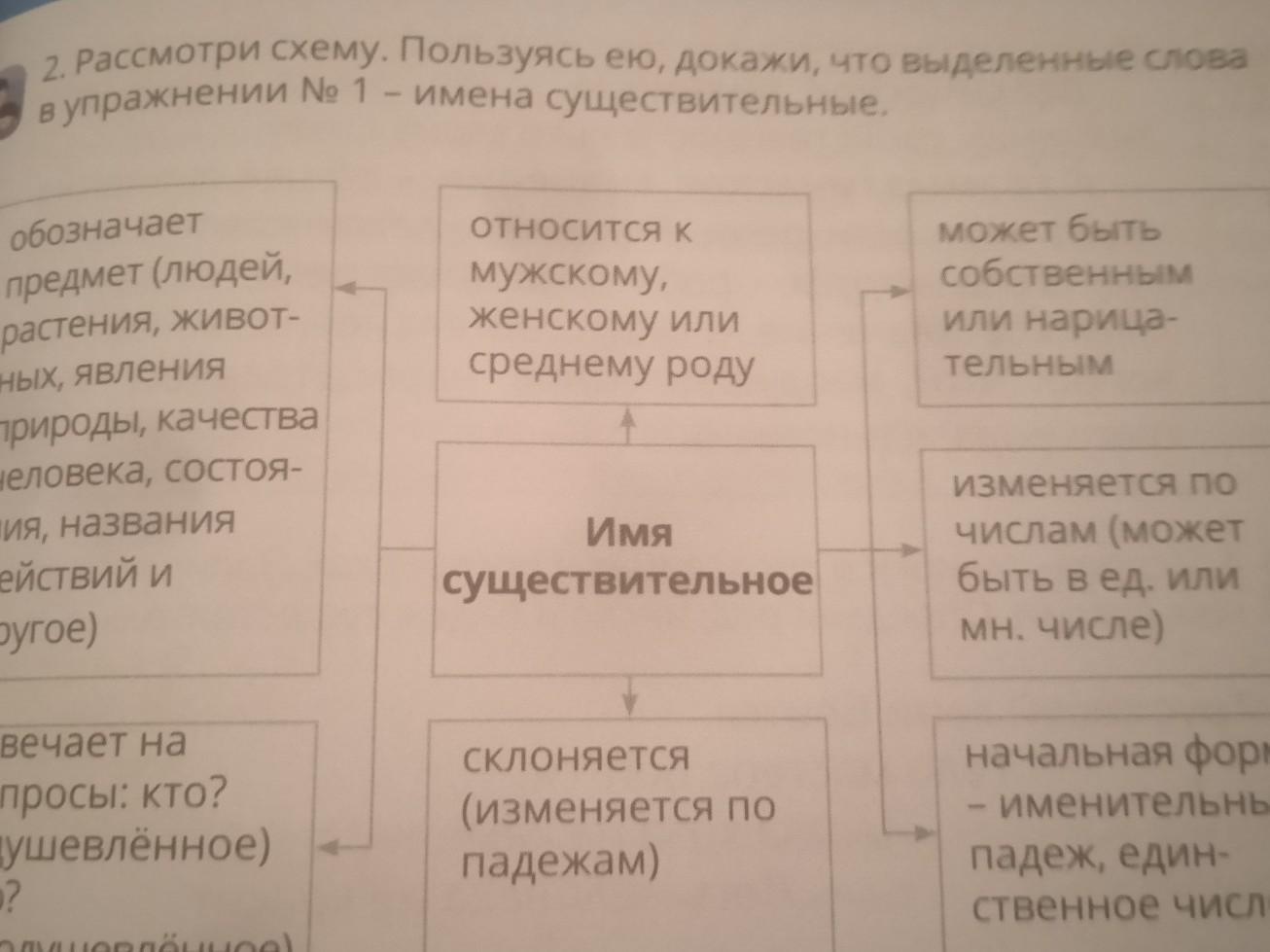 2. Рассмотри схему. Пользуясь ею, докажи, что выделенные слов в упражнении № 1 - имена существительные. обозначает предмет (людей, растения, живот- ных, явления природы, качества человека, состоя ния, названия действий и другое) отвечает на вопросы: кто? (одушевлённое) (неодушевлённое) что? относится к мужскому, женскому или среднему роду Имя существительное склоняется (изменяется по падежам) может быть собственным или нарица- тельным изменяется по числам (может быть в ед. или мн. числе) начальная форма именительный падеж, един- ственное число