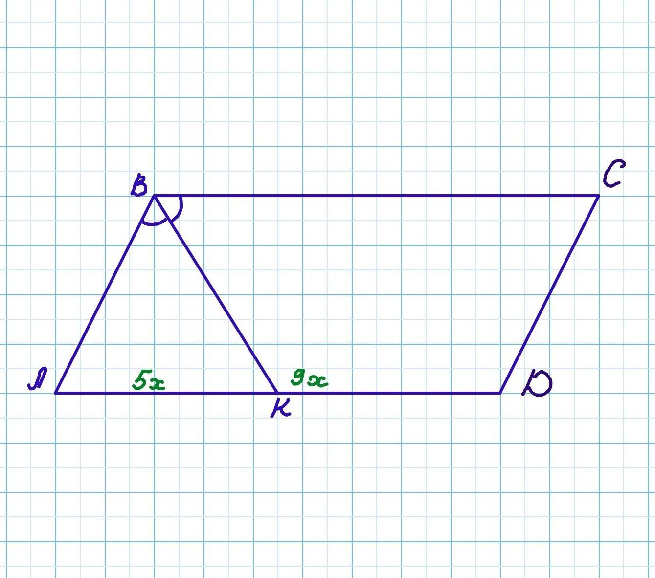 Дано: АВСD - паралелограм, ВК - бісектриса, ∠ABK=∠KBC, AK:KD=5:9, P(ABCD) = 38 см