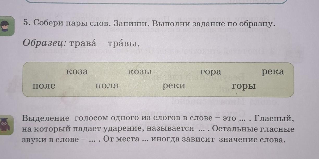 00 5. Собери пары слов. Запиши. Выполни задание по образцу. Образец: трава - травы. поле коза поля козы реки гора горы Выделение голосом одного из слогов в слове - это Гласный, на который падает ударение, называется ... . Остальные гласные звуки в слове - ... . От места ... иногда зависит значение слова. - ... река ● ПОМОГИТЕ ПОЖАЛУЙСТА ЧТО НУЖНО ПОДЧЕРКНУТЬ