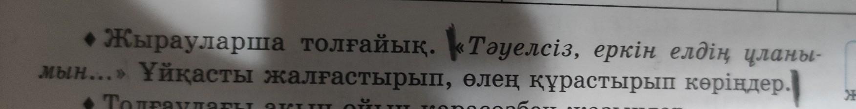 Тәуелсіз,еркін елдің ұланымын.......Ұйқастырып жалғастырып,өлең құрастырып көріңдер пжжжж 5-6ты шумақ 33бет қазақ әдебиеті нен 8сынып