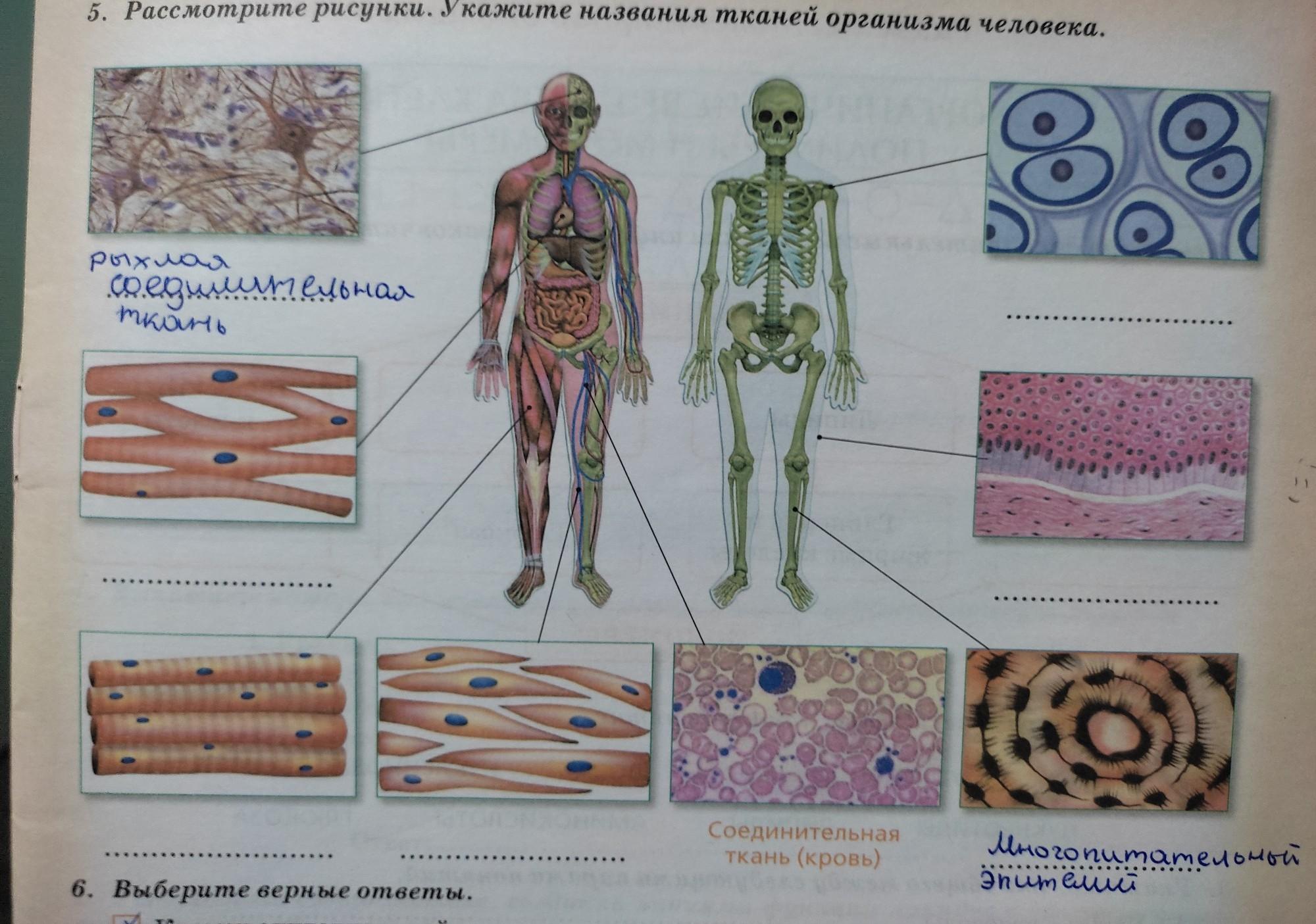 5. Рассмотрите рисунки. Укажите названия тканей организма человека. W Соединительная ткань (кровь) 88 L