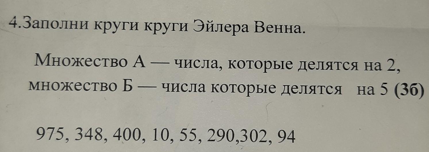 4.Заполни круги круги Эйлера Венна. Множество А-числа, которые делятся на 2, множество Б - числа которые делятся на 5 ( 975, 348, 400, 10, 55, 290,302, 94