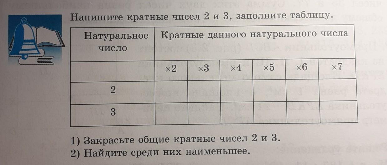 Напишите кратные чисел 2 и 3, заполните таблицу. Натуральное Кратные данного натурального ч числа число 3 х2 x3 х4 х5 1) Закрасьте общие кратные чисел 2 и 3. 2) Найдите среди них наименьшее. х6 X7 II: 181 #M