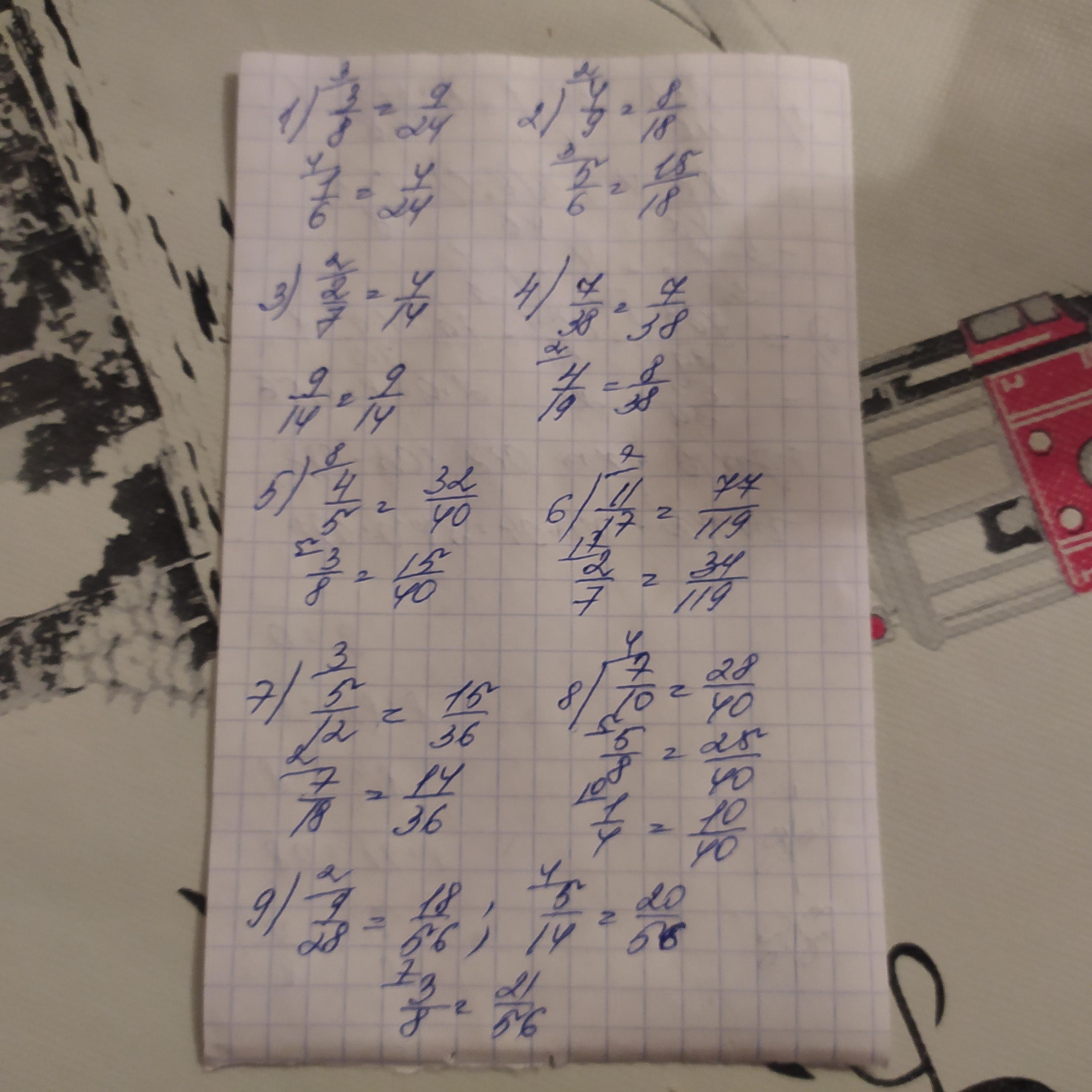 звести до найменшого спільного знаменника дроби: 1) 3/8 і 1/6 2) 4/9 і 5/6 3) 2/7 і 9/14 4) 7/38 і 4/19 5) 4/5 і 3/8 6) 11/17 і 2/7 7) 5/12 і 7/18 8) 7/10; 5/8 і 1/4 9) 9/28; 5/14 і 3/8 . пж Срочно