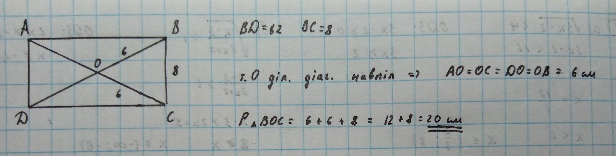 Сторона ВС прямокутника АВСD дорівнює 8 см, а діагональ ВD - 12 см. Знайдіть периметр трикутника ВOС, де О - точка перетину діагоналей прямокутника.