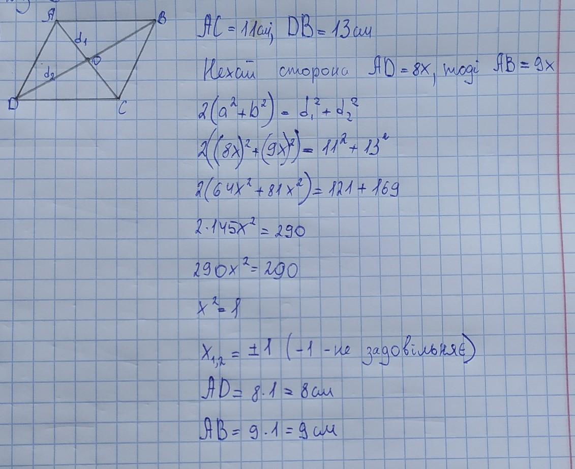 · Діагоналі паралелограма дорівнюють 13 см та 11 см. Знайди сторони паралелограма,