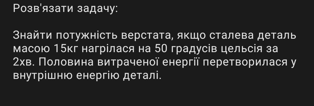 Дано: m = 15 кг t = 2 мин = 120 с AT= 50 °C с = 460 Дж/кг °C AU = Q/2 N-? Количество теплоты на нагревание детали: Q = c'm'∆T = 460*15*50 = 345 000 Дж ∆U = Q/2 = 172 500 Дж Мощность: N = ∆U / t = 172 500 / 120 = 1440 Вт или 1,44 кВт