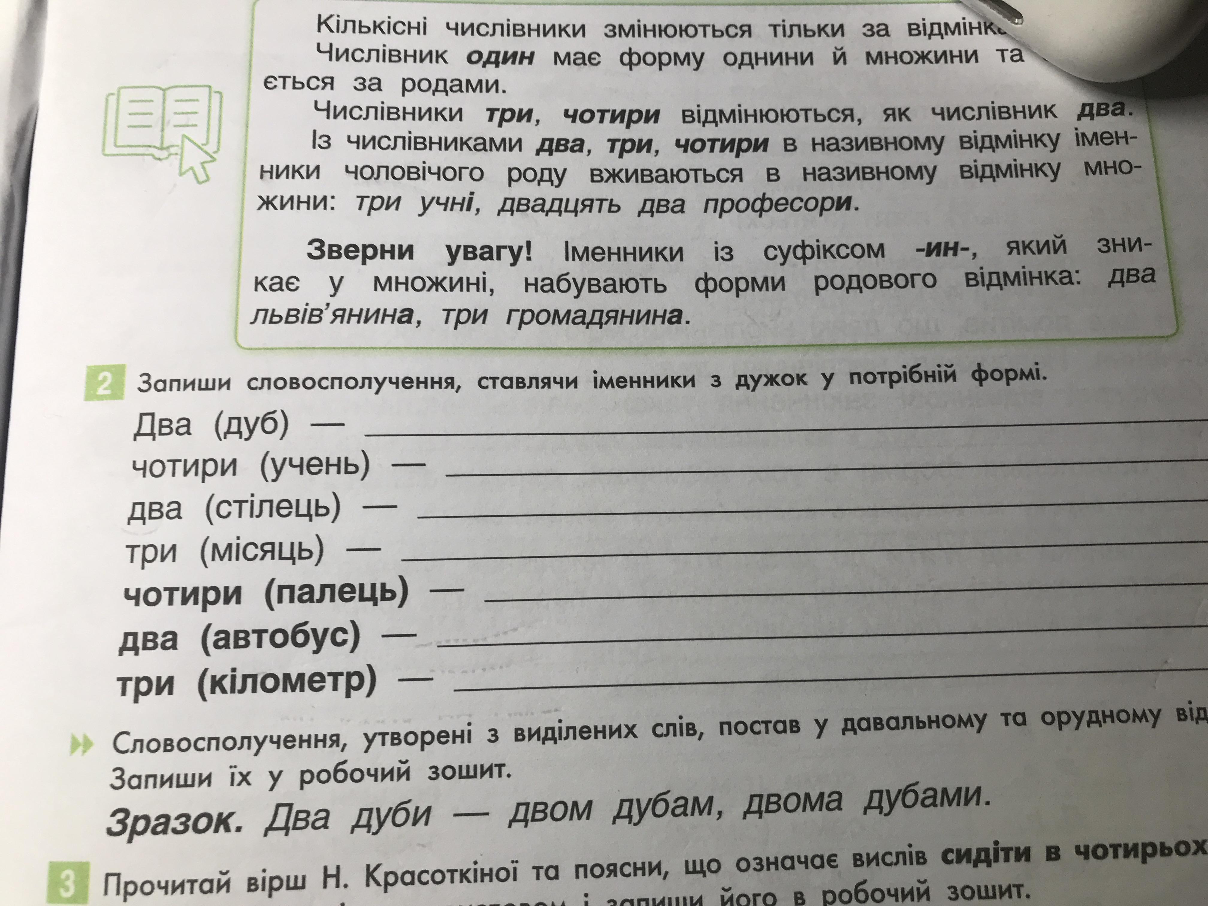 Відповідь:Два дуби , чотири учні , два стільця , три місяці , чотири пальці , два автобуси , три кілометри .