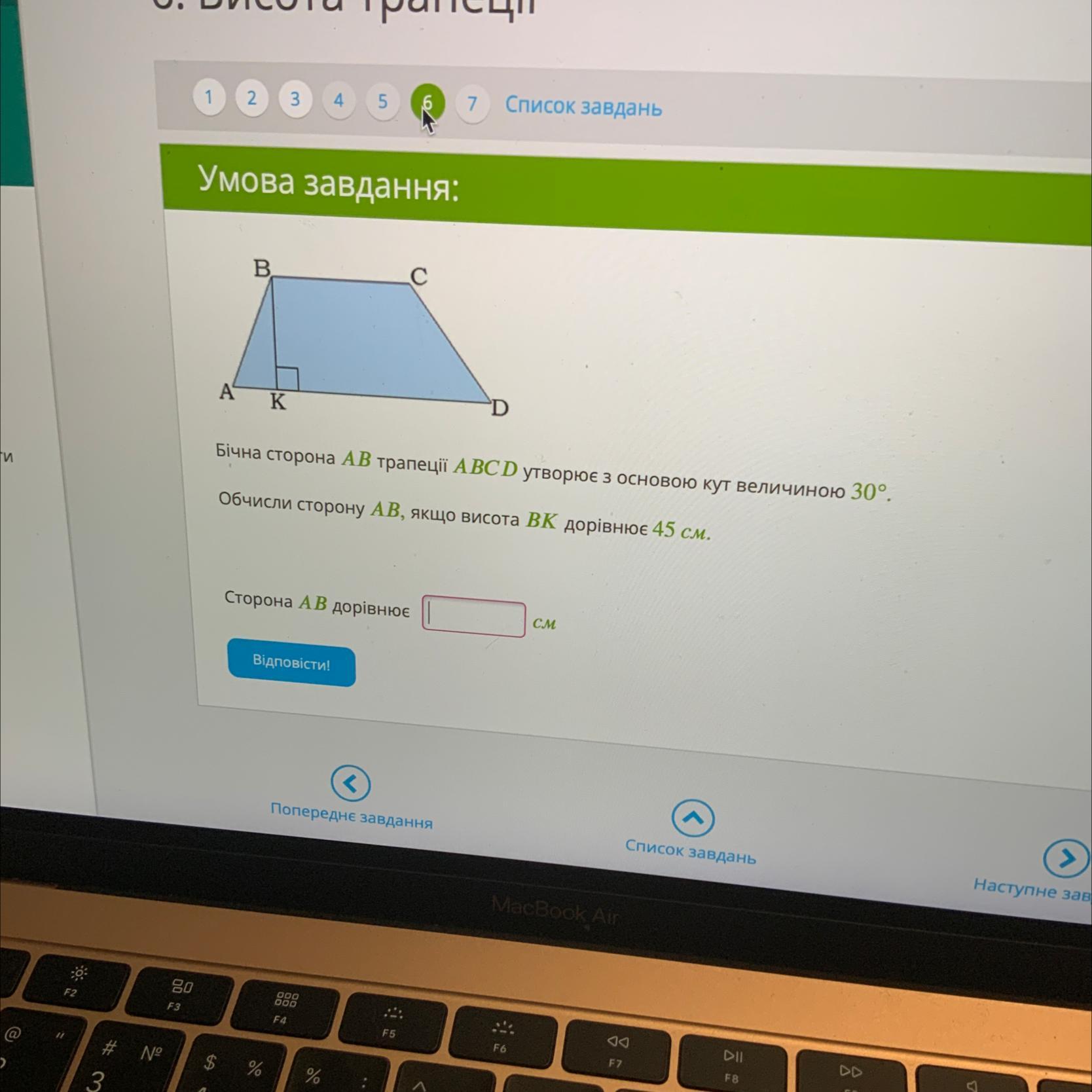 Обчисли сторону AB, якщо висота ВК дорівнює 45 см.