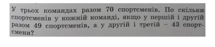 70 - 43 = 27( перша команда 49-27=23( друга команда) 70-(27+23)=20(третя команда)