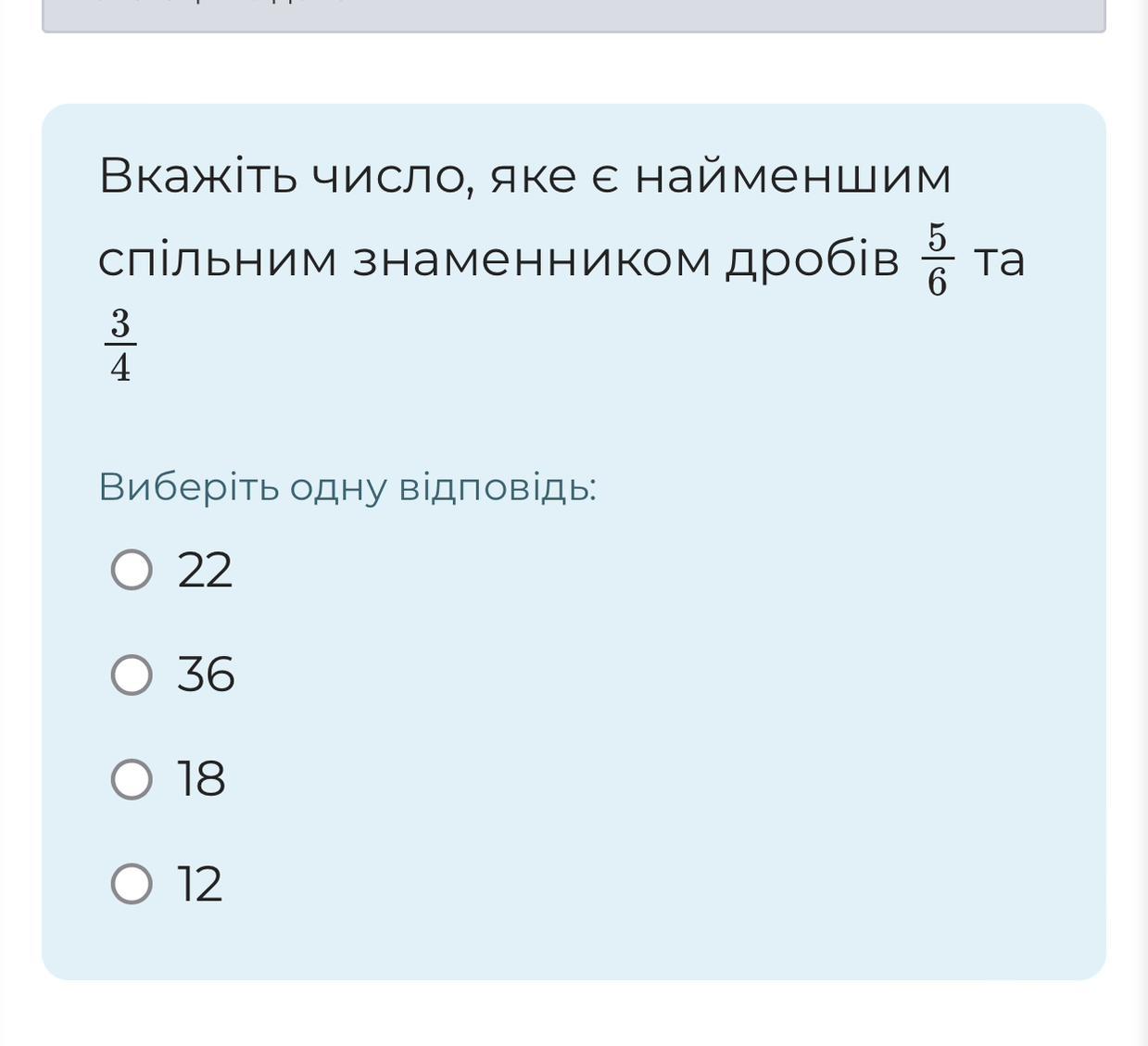 Вкажіть число, яке є найменшим спільним знаменником дробів