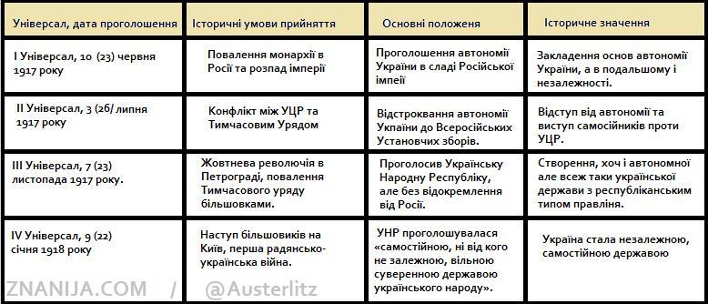 Універсали -- це головні документи-постанови Української Центральної Ради, які визначили та ознаменували етапи створення української державності. Всього було прийнято та оприлюднено 4 універсали: І, ІІ, ІІІ, IV відповідно.