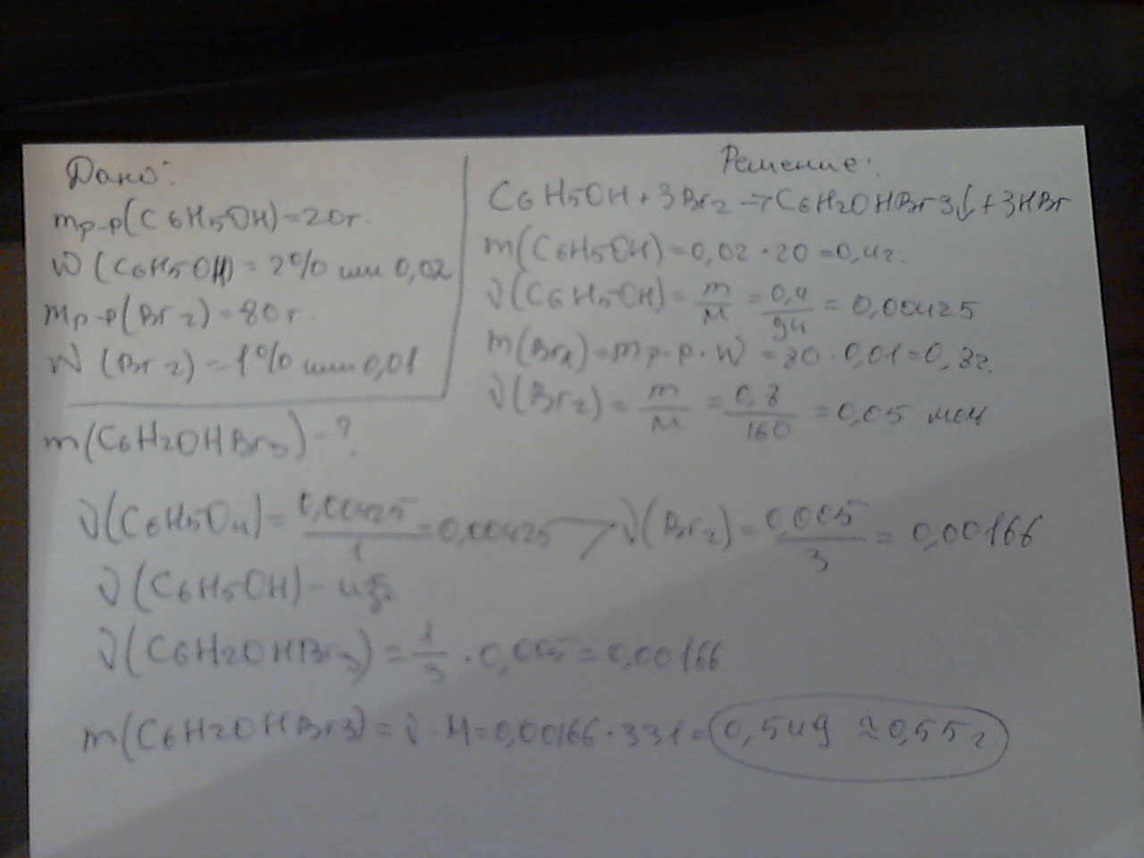 Определите массу осадка, образовавшегося при смешении 20 г 2%-ого водного раствора фенола и 80 г бромной воды с массовой долей брома 1%.