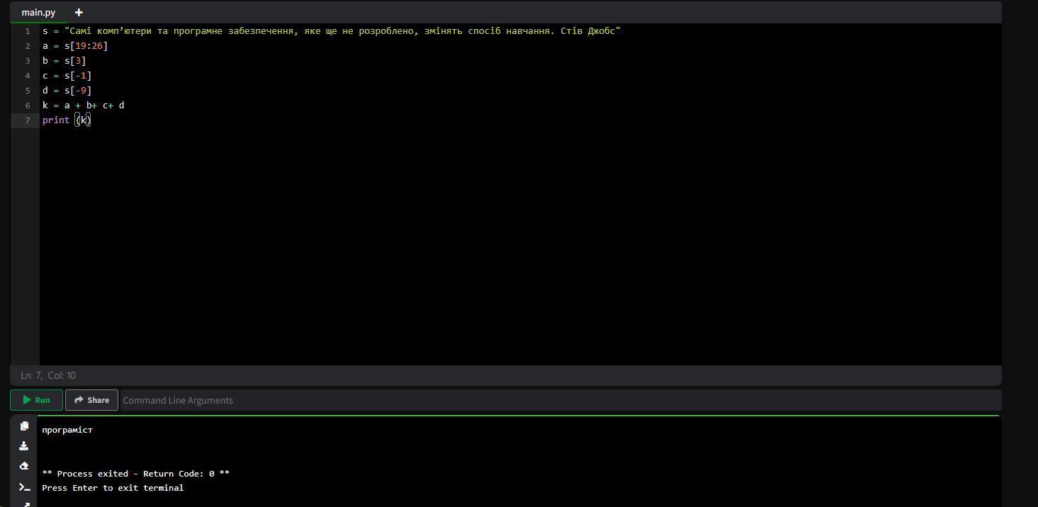 Відповідь:s = "Самі комп’ютери та програмне забезпечення, яке ще не розроблено, змінять спосіб навчання. Стів Джобс"