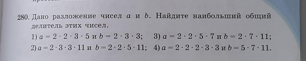 280. Дано разложение чисел ань. Найдите наибольший общий делитель этих чисел. 1)a-2·2·3·5ub-2-3-3; 2) a-2.3.3.11 n b-2-2-5-11: 3) a-2-2-5-7 ub-2-7-11; 4) a-2-2-2-3-3mb-5-7-11.
