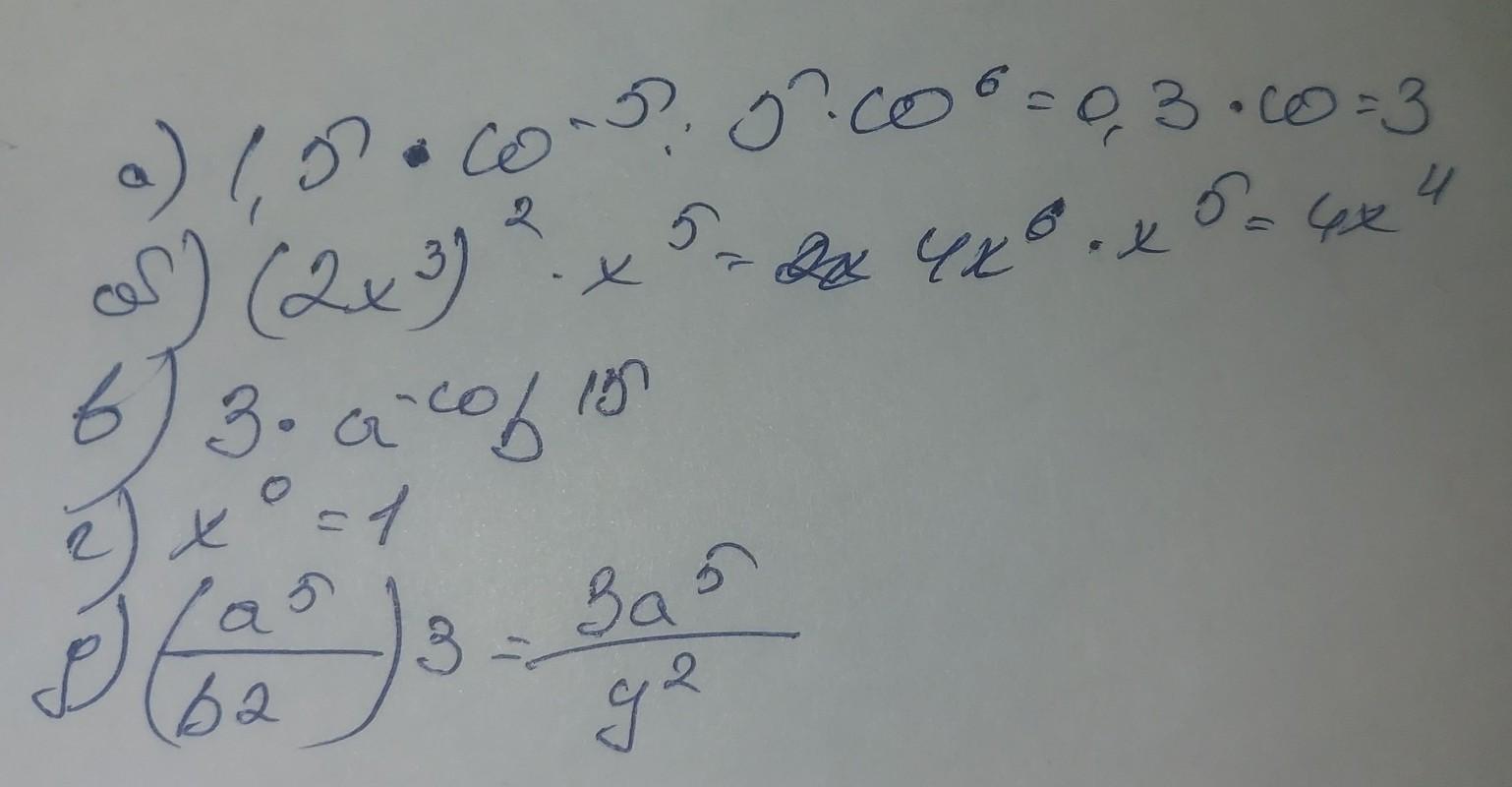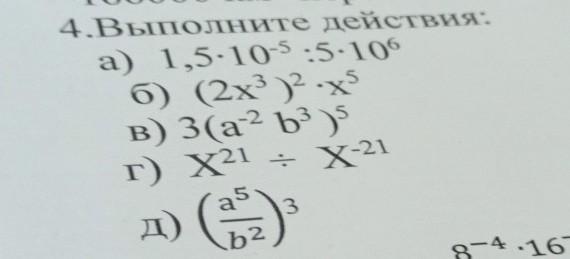4.Выполните действия: a) 1,5-10-5:5-106 3 б) (2x³)2.x в) 3(a² b3 ) г) X21 ÷ X-21 as 13 д) b2 8-4