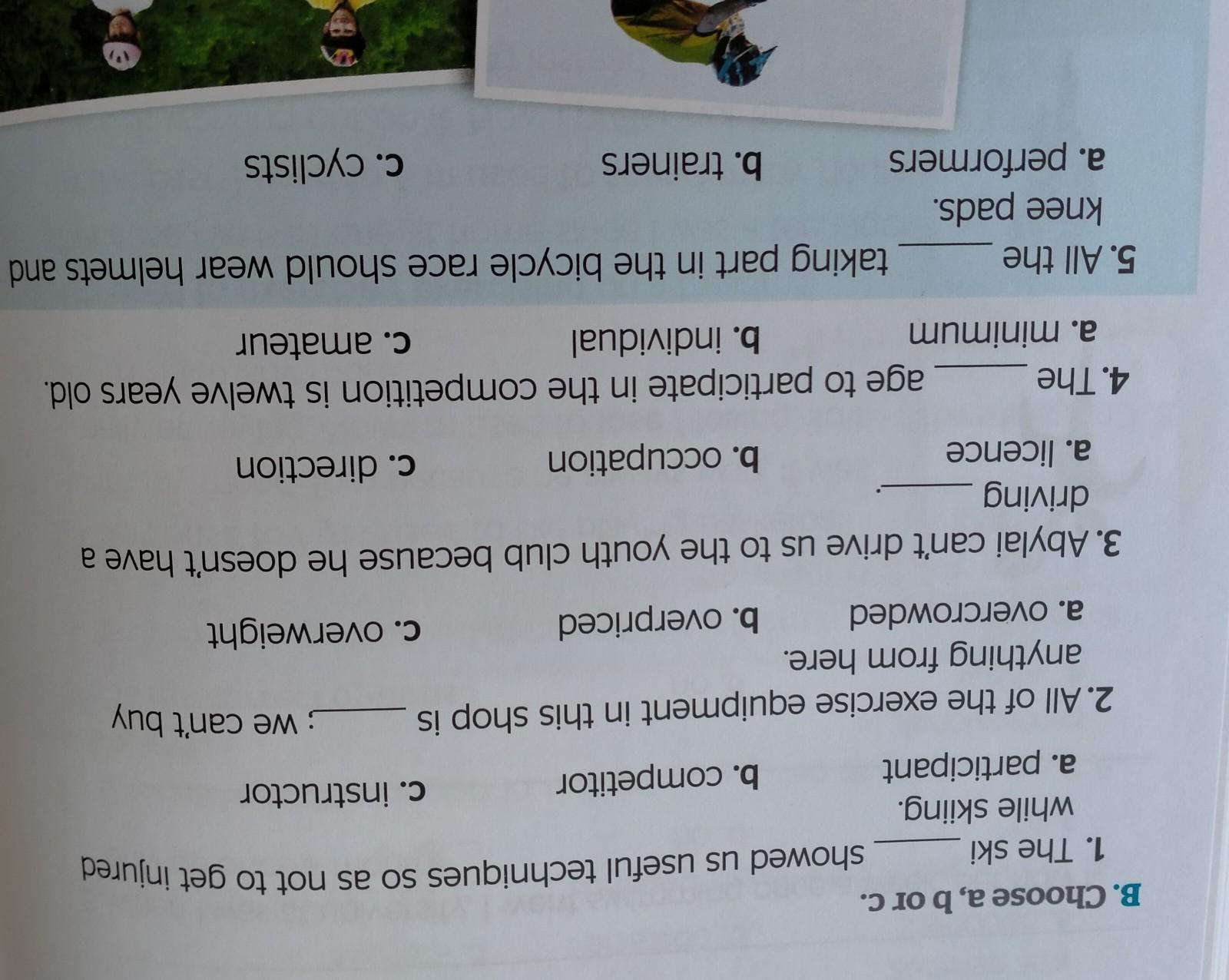 B. Choose a, b or c. 1. The ski showed us useful techniques so as not to get injured b. competitor c. instructor 2. All of the exercise equipment in this shop is ________: we can't buy anything from here. a. overcrowded while skiing. a. participant b. overpriced c. overweight 3. Abylai can't drive us to the youth club because he doesn't have a driving a. licence b. occupation c. direction 4. The age to participate in the competition is twelve years old. b. individual a. minimum c. amateur taking part in the bicycle race should wear helmets and 5. All the knee pads. a. performers b. trainers c. cyclists